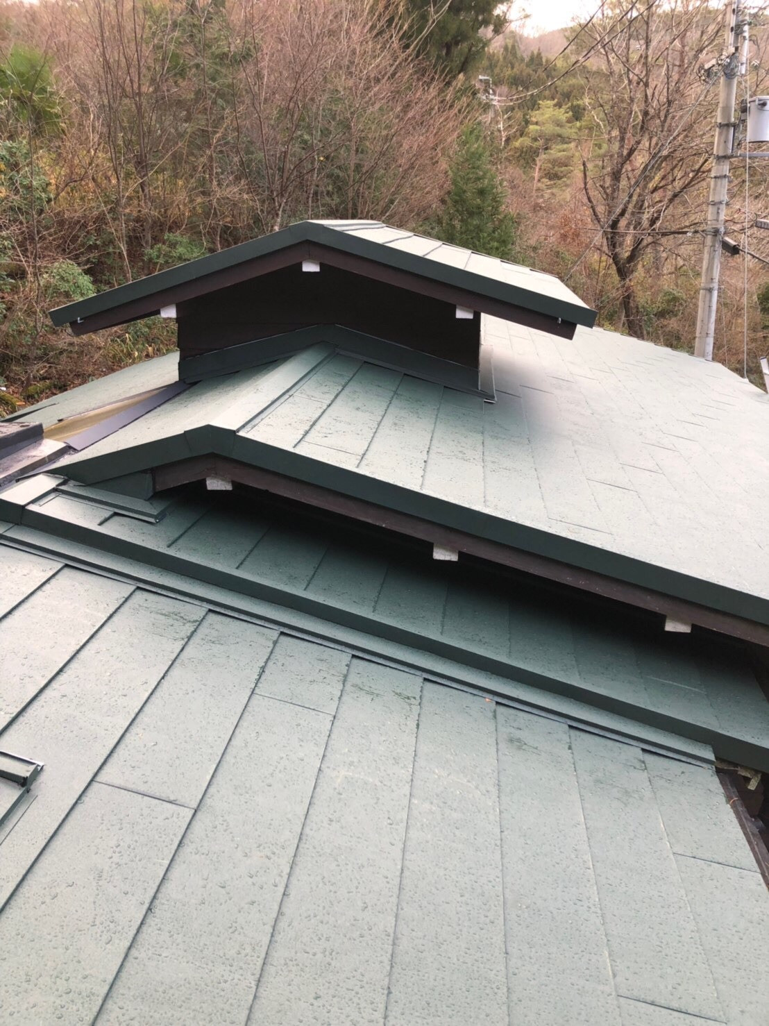 大阪 交野市で屋根の葺き替え工事をしました。山てにあるお家なので空気がキレイでとても自然あふれるいい場所でした。山ては天候の変化も多いせいか、とても苔が生えていました。今回施工したスーパーガルテクトはさびにくく、苔も生えにくいのでとてもオススメです。