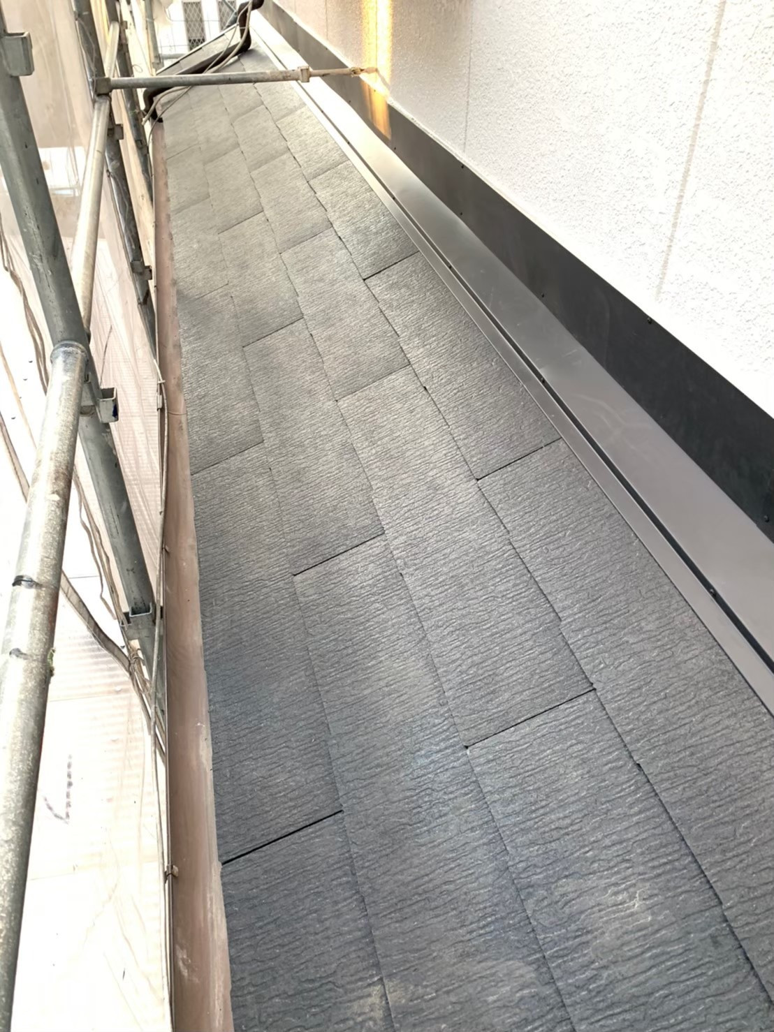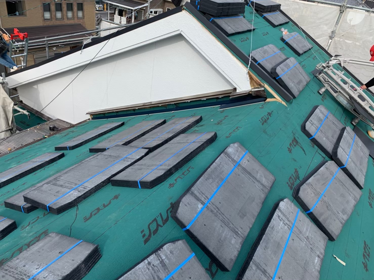 一枚目の写真にあるのは、カラーベストの板金役物のケラバ捨水切り、軒先水切りになります。どの屋根材を葺く前にも必ず必要となるものです。